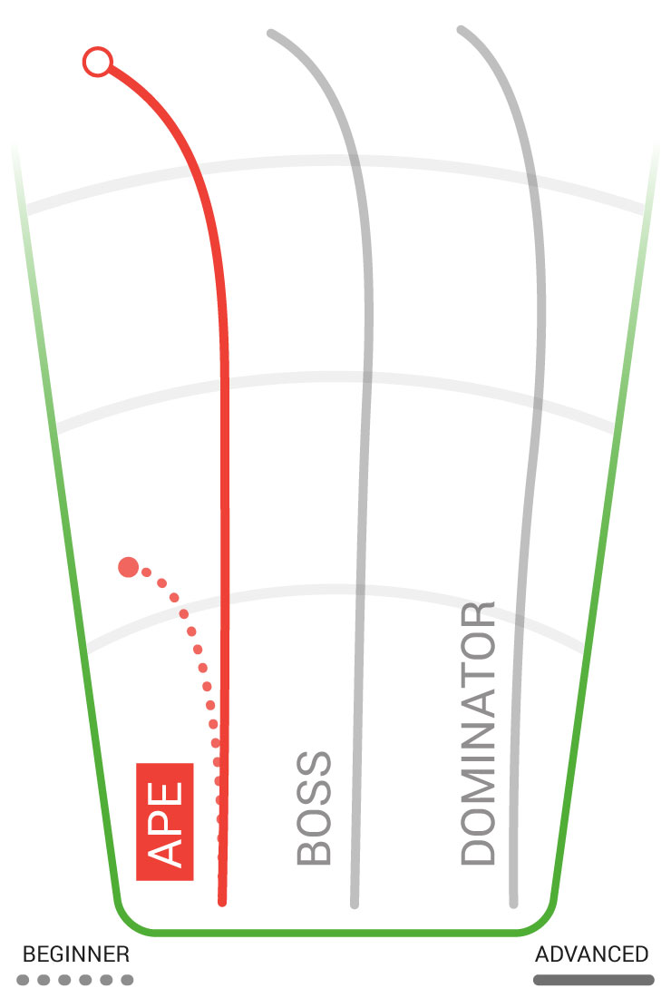 Innova Ape – poradzi sobie z mocą największych ramion disc golfa. Niezwykle szybki i stabilny, Ape to „must have” na długie dystanse w wietrznych warunkach. Gracze Forhend’owi dowiedzą się, że Ape jest więcej niż zdolny do wytrzymania nawet najbardziej intensywnego momentu obrotowego. Ape to doskonały wybór do rzutów Backhandowych lub wspomnianego Sidearm’u, a także do różnych niszowych flex shotów. Ape nie jest polecany graczom, którzy rzucają na odległość mniejszą niż 90 metrów (300 ft.)